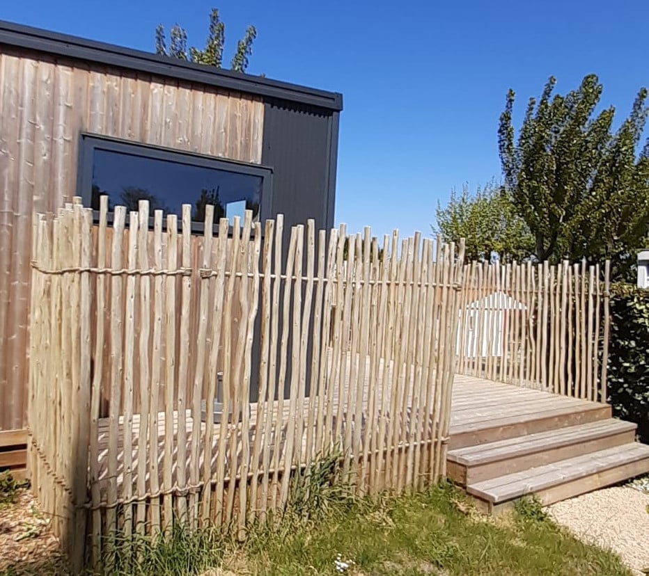 La clôture Cordéa est en rondins d’eucalyptus irréguliers, assemblés entre eux par deux tiges en acier galvanisé recouvertes de corde naturelle.