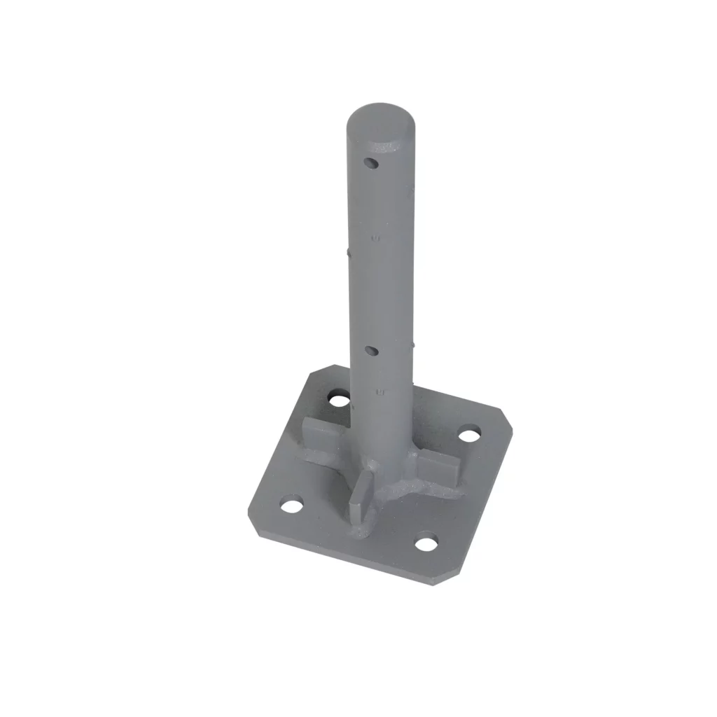 La platine fixée au poteau permet de sceller sur tout type de sol dur.